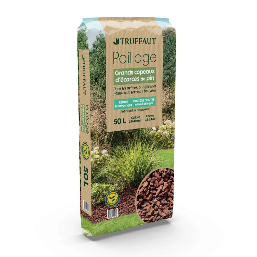 Ces copeaux d’Ă©corces de pin maritime vous permettront d’enrichir vos plantations et de leur procurer plusieurs autres bienfaits. Le pin maritime a, en effet, une action drainante et favorise ainsi la reprise et la croissance des plantes. Il rĂ©duit l’Ă©vaporation et amĂ©liore l’infiltration de l’eau permettant ainsi de rĂ©aliser des Ă©conomies d’arrosage. Ce paillage limite le dĂ©veloppement de mauvaises herbes en faisant barrage Ă la lumière. Ainsi, vous effectuerez des Ă©conomies de dĂ©sherbant et protĂ©gerez les racines de vos plantes du froid. Vendus en sac de 50 L, ces copeaux sont de calibre moyen.