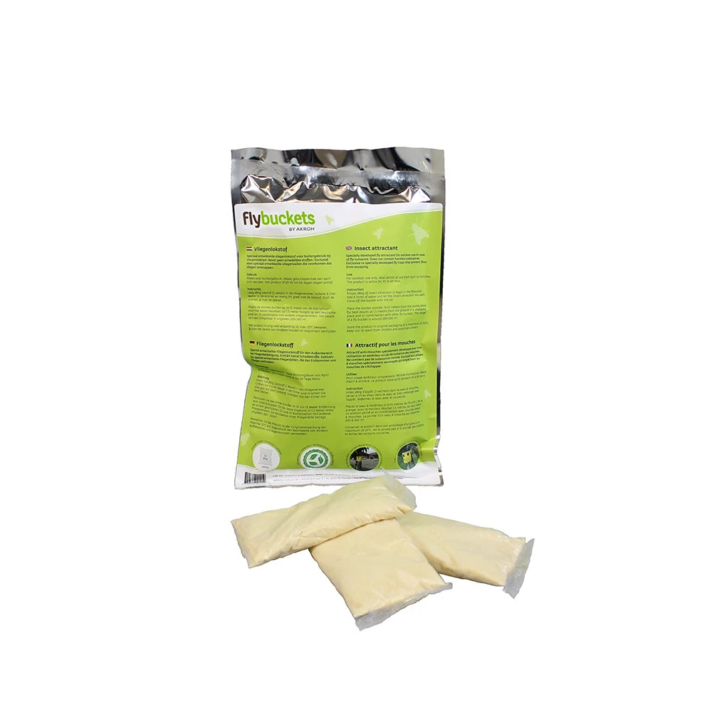 Recharge de 240 grammes composĂ©e Ă 100 % de matière naturelle. A mĂ©langer avec 6 litres d’eau dans le piège Ă mouches fly bucket.
